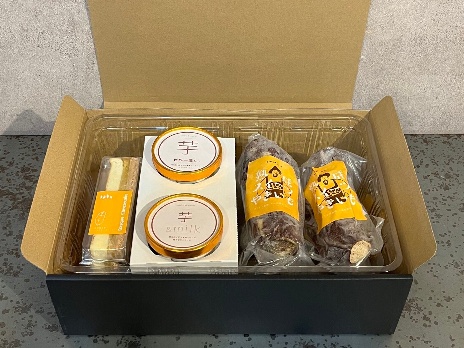 このギフトBOXには、自慢の冷やし焼き芋、お芋スイーツがたっぷり入っています。冷凍状態でアイス焼き芋、半解凍で甘みたっぷり冷やし焼き芋と好みで食べた方選べる焼き芋、、濃厚で口溶けがよくお芋との相性抜群なバスクチーズケーキ、素材本来の香りと旨みを生かした3つの濃さに分かれたお芋ジェラートなど、バラエティ豊かなラインナップでお楽しみいただけます。